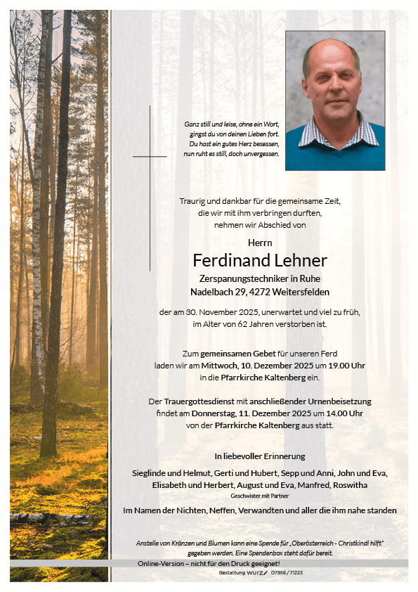 Mit Dir,Ferdinand haben wir einen wertvollen Menschen und tollen Arbeitskollegen verloren, es war eine schöne Zeit mit Dir,Du wirst immer in Erinnerung bleiben.
